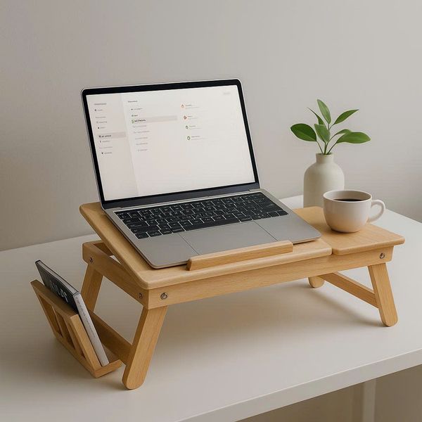Bàn laptop Gỗ Đức Thành 22311 làm từ gỗ cao su với thiết kế mới lạ, trên bề mặt có nhiều thanh gỗ xếp song song với nhau tạo khoảng hở cần thiết, giúp laptop hoạt động trong nhiều giờ mà vẫn tản nhiệt tốt, không gây nóng máy. Mặt bàn laptop còn được thiết kế thông minh, có thể tăng giảm độ nghiên để thuận tiện cho người dụng khi ngồi làm việc dưới sàn nhà, làm việc trên giường hoặc ở ngoài trời... Khi không dùng bà laptop nữa có thể gấp lại, rất tiện gọn nên có thể mang theo để sử dụng khi cần thiết. Sản phẩm rất tiện lợi, phù hợp nhiều đối tượng học sinh, sinh viên, nhân viên văn phòng v.v…