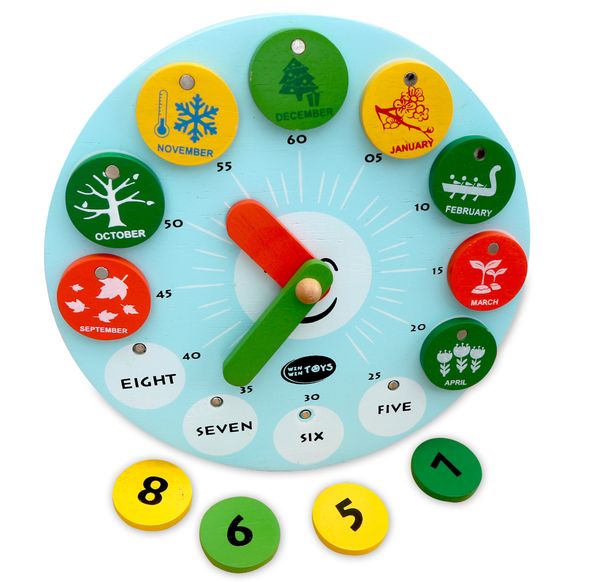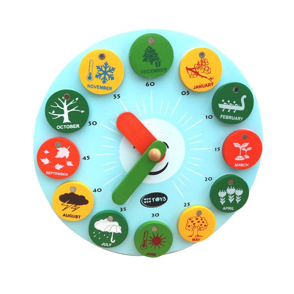 Đồ chơi Đồng hồ thời tiết của Winwintoys bao gồm 12 thẻ tròn, mặt trước in số từ 1 - 12 , mặt sau in các hình ảnh sự vật tương ứng với các mùa, thời tiết và tương ứng với các tháng trong năm.