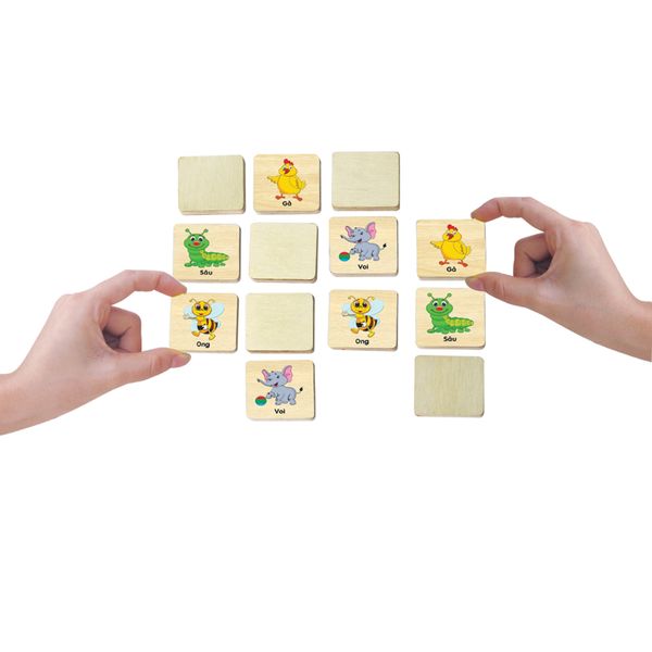 - Bé 4 tuổi trở lên: Úp các thẻ gỗ thành từng hàng, sau đó mỗi bé mở liên tục 2 thẻ gỗ lên, nếu hình giống nhau là thắng, nếu không giống nhau thì úp xuống lại. Bé phải nhớ hình con vật ở vị trí nào để lượt sau mở lên tìm cho đúng cặp.