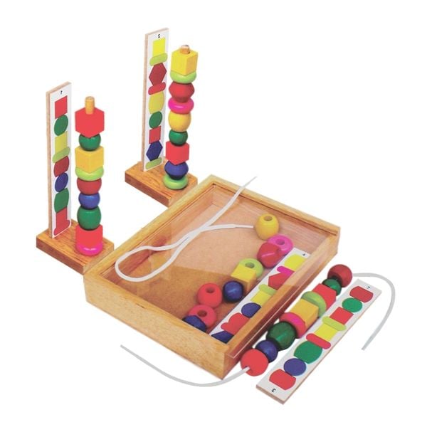 Sản phẩm gồm có 4 thẻ, 3 sợi và 36 khối gỗ.